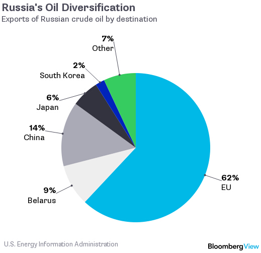 克里姆林宮和俄羅斯的石油公司長期以來已經感知到歐洲正在試圖實現其能源供應的多元化。俄羅斯也在尋找新的市場。到2000年時,俄羅斯幾乎所有的石油出口都是去往歐洲。但是在去年,這一比例下降至不足三分之二。