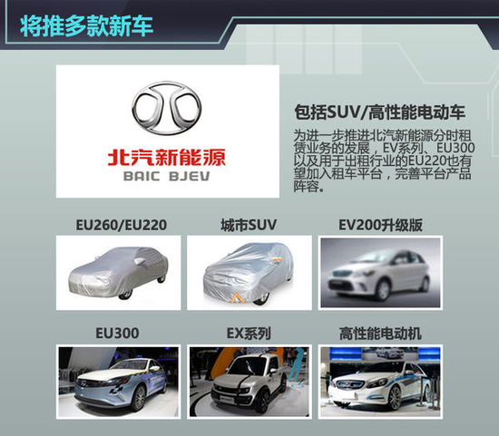 據(jù)了解,北汽新能源將于今年年底前推出EV200升級版和全新A級車;而到2016年,包括純電動SUV、EX系列、EU300以及北汽新能源與Atieva聯(lián)合開展的高性能電動汽車也將悉數(shù)登場亮相。未來北汽新能源旗下或將覆蓋轎車、SUV和MPV三個細分領域,車型級別可以從A0級擴展至C級。為進一步推進北汽新能源分時租賃業(yè)務的發(fā)展,EV系列、EU300以及用于出租行業(yè)的EU220也有望加入租車平臺,完善平臺產品陣容。