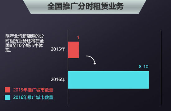 由于新能源市場的迅猛發(fā)展,越來越多的企業(yè)開始著力研發(fā)新能源汽車,作為先期布局新能源市場的北汽新能源,目前市場銷量已經超過行業(yè)平均水平。數(shù)據(jù)顯示,今年1-9月份,北汽新能源累計銷量達到11,247輛,同比增長11倍之多。市場銷量除新車的密集投放以及大力推廣外,行業(yè)渠道也是直接影響企業(yè)銷量的關鍵之一。此前,北京新能源汽車與鴻海集團共同組建了電動汽車分時租賃公司——北京恒譽新能源汽車租賃有限公司的“GreenGo綠狗租車”品牌,而后又與寶駕租車進行戰(zhàn)略合作,后續(xù)三方將在企業(yè)互聯(lián)網+的發(fā)展與運用進一步發(fā)力。日前,北汽新能源副總經理兼營銷公司總經理張勇在接受網通社采訪時表示:“我們已開始全面布局分時租賃業(yè)務,明年我們的發(fā)展模式將向全國8-10個城市擴張。”