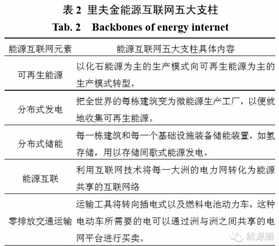 杰里米•里夫金指出未來能源體系的特征是能源生產民主化、能源分配分享互聯網化,即組建以可再生能源+互聯網為基礎的能源共享網絡,在能源通過分散的途徑被生產出來之后,利用互聯網創造新的能源分配模式。該文提出的新經濟五大支柱如表2所示。
