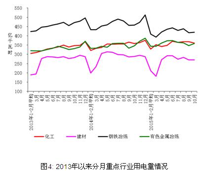 1-10月份,化學原料制品、非金屬礦物制品、黑色金屬冶煉、有色金屬冶煉四大高載能行業用電量合計13877億千瓦時,同比下降 2.3%,增速同比回落6.4個百分點;合計用電量占全社會用電量的比重為30.3%,對全社會用電量增長的貢獻率為-99.7%。其中,化工行業用電量3534億千瓦時,同比增長2.2%,增速同比回落2.9個百分點;建材行業用電量2563億千瓦時,同比下降6.5%,增速同比回落13.4個百分點;黑色金屬冶煉行業用電量4224億千瓦時,同比下降7.8%;增速同比回落9.5個百分點;有色金屬冶煉行業3556億千瓦時,同比增長3.8%,增速同比回落0.5個百分點。