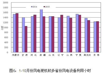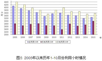 分類型看,1-10月份,全國水電設備平均利用小時2989小時,同比降低114小時;水電裝機容量超過1000萬千瓦的7個省份中,四川、青海、云南、湖北和湖南同比分別下降331小時、254小時、230小時、184小時和105小時;貴州和廣西同比分別提高351小時和381小時。全國火電設備平均利用小時3563小時,同比下降304小時,降幅比2014年同期擴大68小時;海南利用小時數超過4500小時;四川、云南和西藏火電設備利用小時低于2500小時,分別為2269小時、1296小時和63小時;與上年同期相比,共有27個省份火電利用小時同比下降,較上月增加2個省份(其中,云南下降超過900小時)。全國風電設備平均利用小時1473小時,同比下降33小時。