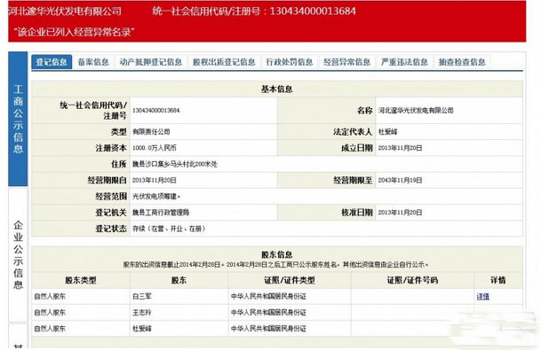 杜愛峰作為法人的河北邃華光伏發電有限公司注冊資金1000萬,擬定投資6.5億建設光伏發電項目。據公司業務人員稱由于沒有資金,項目只是圈了地,至今未開工。