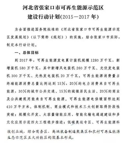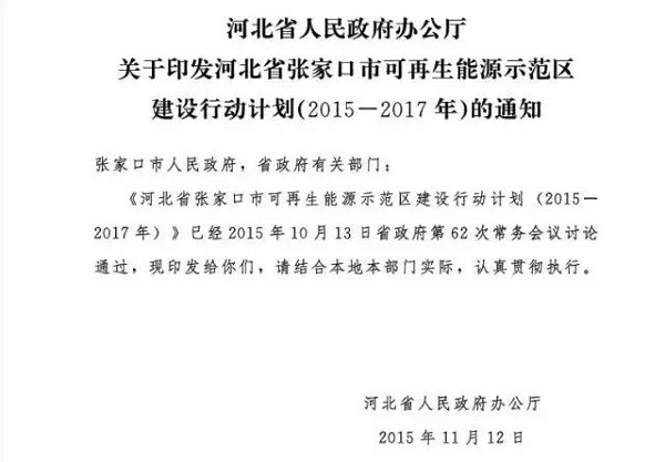 《河北省張家口市可再生能源示范區建設行動計劃(2015-2017年)》發布
