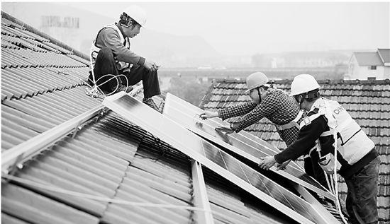昨天,桐廬縣江南鎮荻浦村申屠長慶家的屋頂上,3名來自浙江正泰電器股份有限公司的工作人員,正在忙著安裝太陽能光伏電池板。