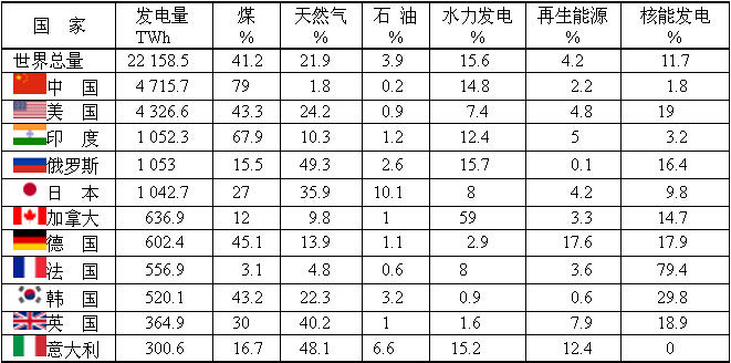 電力生產結構是根據各國所處的地理位置和國際貿易所決定的。根據WB報告2011年電力生產的來源,全球仍以燃煤發電為主,中國最多,燃煤發電占79%,而法國則以核能發電為主,占發電總量的79.4%,俄羅斯以燃氣發電為主,占49.3%。