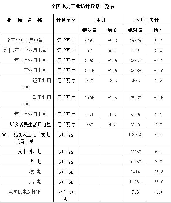 10月份,全社會用電量4491億千瓦時,同比下降0.2%。