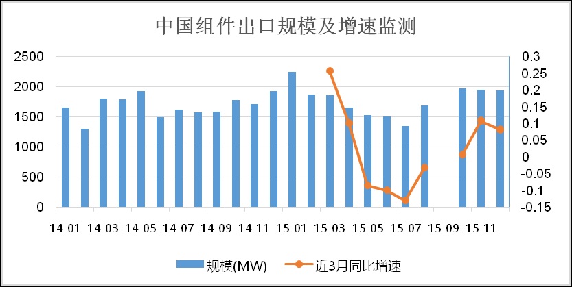 2015年第4季度中國光伏組件出口相比第3季度有較大提升,特別是11月、12月出口規模與去年同期相比均為正增長。第4季度,中國組件合計出口5.9GW,同比增長約8%。事實上,從8月開始情況便已經出現好轉。