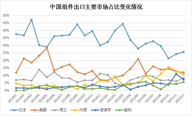 日本一直是中國組件出口的最大目的國市場,也是世界上最大的光伏應用市場之一。2015年第1季度,日本占中國組件出口份額為41%。此后整體呈下跌趨勢。到第4季度日本的份額已降至24%。日本份額的下降主要由于日本光伏市場增長的放緩。2015年4月后日本的FIT收購價格大幅下降,而組件成本的自然下降又不足以彌補IRR的降低,從而抑制了裝機量的增長。