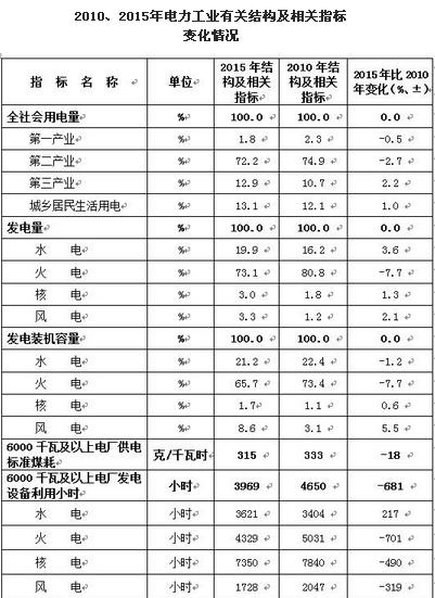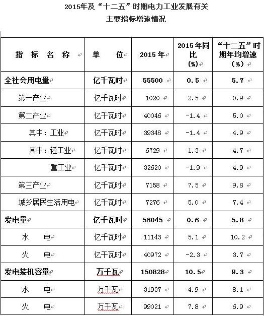 2015年,受宏觀經(jīng)濟(jì)尤其是工業(yè)生產(chǎn)下行、產(chǎn)業(yè)結(jié)構(gòu)調(diào)整、工業(yè)轉(zhuǎn)型升級以及氣溫等因素影響,全社會用電量同比增長0.5%、增速同比回落3.3個百分點,第二產(chǎn)業(yè)用電量同比下降1.4%、40年來首次負(fù)增長。固定資產(chǎn)投資特別是房地產(chǎn)投資增速持續(xù)放緩,導(dǎo)致黑色金屬冶煉和建材行業(yè)用電同比分別下降9.3%和6.7%,兩行業(yè)用電下降合計下拉全社會用電量增速1.3個百分點,是第二產(chǎn)業(yè)用電量下降、全社會用電量低速增長的主要原因;兩行業(yè)帶動全社會用電增速放緩的影響明顯超過其對經(jīng)濟(jì)和工業(yè)增加值放緩產(chǎn)生的影響,這是全社會用電增速回落幅度大于經(jīng)濟(jì)和工業(yè)增加值增速回落幅度的主要原因。四大高耗能行業(yè)用電量比重同比降低1.2個百分點,第三產(chǎn)業(yè)和城鄉(xiāng)居民生活用電比重同比分別提高0.8個和0.6個百分點、分別拉動全社會用電量增長0.9和0.6個百分點,反映出國家經(jīng)濟(jì)結(jié)構(gòu)調(diào)整效果明顯,工業(yè)轉(zhuǎn)型升級步伐加快,拉動用電增長的主要動力正在從傳統(tǒng)高耗能產(chǎn)業(yè)向新興產(chǎn)業(yè)、服務(wù)業(yè)和生活用電轉(zhuǎn)換,電力消費結(jié)構(gòu)在不斷調(diào)整。全年新增發(fā)電裝機(jī)容量創(chuàng)歷史最高水平,年底發(fā)電裝機(jī)達(dá)到15.1億千瓦、供應(yīng)能力充足,非化石能源發(fā)展迅速、年底非化石能源發(fā)電裝機(jī)比重提高到35.0%;火電發(fā)電量負(fù)增長、利用小時降至4329小時。全國電力供需進(jìn)一步寬松、部分地區(qū)富余。