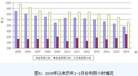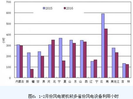 分類型看,1-2月份,全國水電設備平均利用小時445小時,同比增長72小時;水電裝機容量超過1000萬千瓦的7個省份中,只有青海同比下降50小時,其余省份都有所增加,其中湖南增長289小時,貴州增長121小時,廣西增長100小時。全國火電設備平均利用小時656小時,同比下降83小時,降幅比2015年同期擴大31小時;其中北京、河北、江蘇、安徽利用小時數接近或超過800小時;與上年同期相比,共有25個省份火電利用小時同比下降,其中,四川、西藏、青海及福建下降超過300小時。全國核電設備平均利用小時1025小時,同比下降68小時。全國風電設備平均利用小時263小時,同比下降39小時。