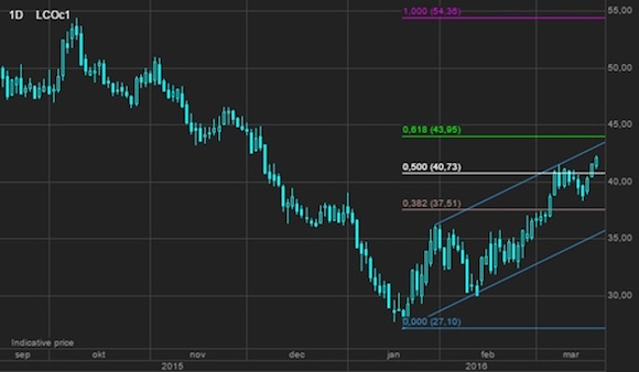 因此,Hansen認為布倫特原油價格上行在44美元/桶受到限制,該水平是10月至1月跌勢的61.8%,而如果跌破38.3美元/桶將進一步跌至35美元/桶水平。
