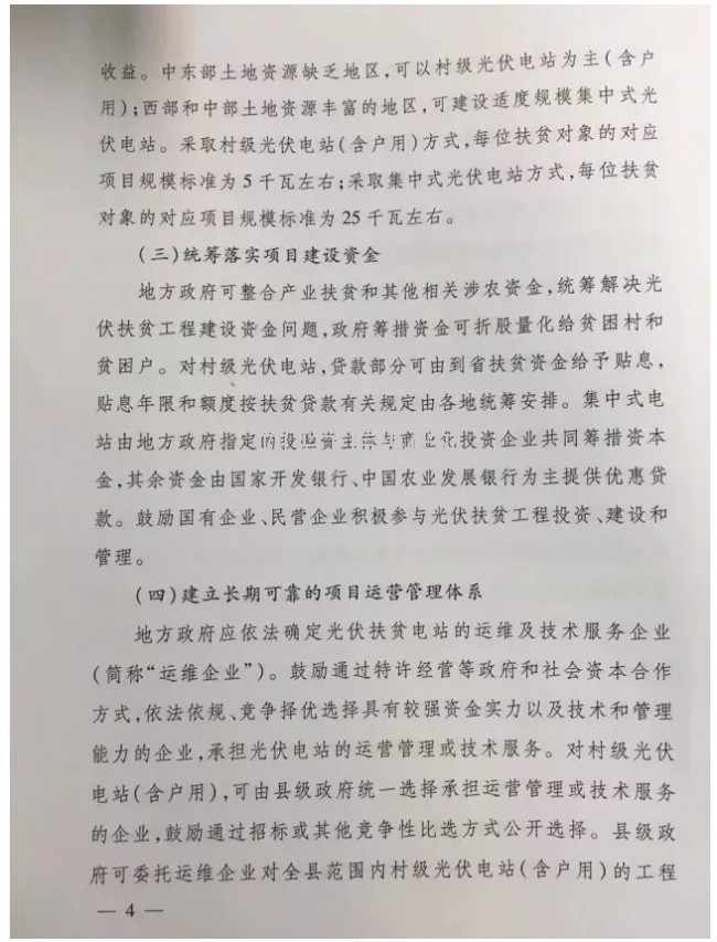 采用村級光伏電站(含戶用)方式,每位扶貧對象的對應項目規模標準為5千瓦;采取集中式光伏電站方式,每位扶貧對象的對應項目規模標準為25千瓦。