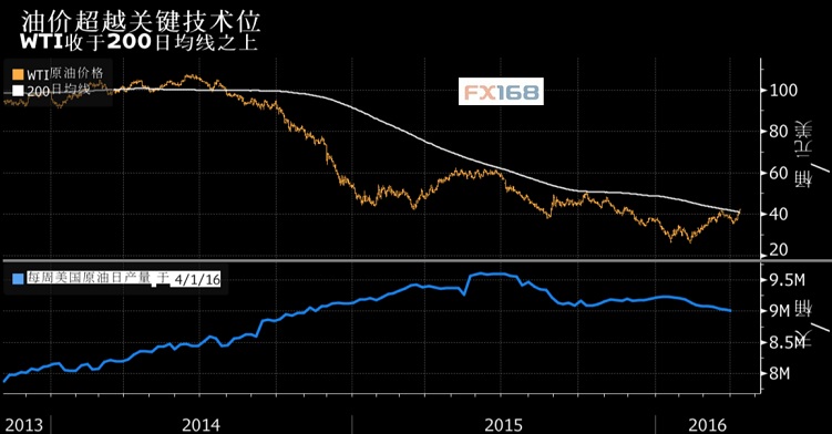 因美國原油產(chǎn)量繼續(xù)下降,美國基準(zhǔn)原油價(jià)格(WTI)周二(4月12日)盤中曾一度刷新每桶42.25美元的去年11月來最高位,同時(shí)也是自2014年7月以來首次突破200日均線。此外,標(biāo)普500能源指數(shù)也將在2014年9月以來首次突破200日均線。