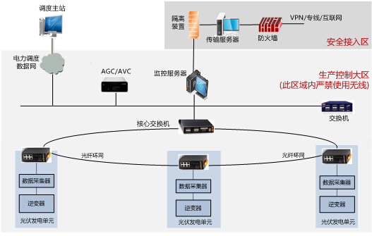 光伏電站生產(chǎn)控制大區(qū)與安全接入?yún)^(qū)典型結(jié)構(gòu)示意圖