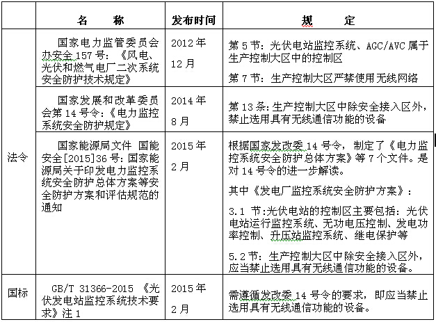 基于上述背景,2004年,原電監(jiān)會(huì)發(fā)布《電力二次系統(tǒng)安全防護(hù)規(guī)定》(簡(jiǎn)稱(chēng)5號(hào)令),明確了電力監(jiān)控系統(tǒng)的總體策略;近幾年光伏發(fā)電高速發(fā)展,2012年起,主管部門(mén)至少4次出臺(tái)了國(guó)家標(biāo)準(zhǔn)和相關(guān)法令,嚴(yán)禁在發(fā)電單元的生產(chǎn)控制大區(qū)通訊中使用無(wú)線通訊。