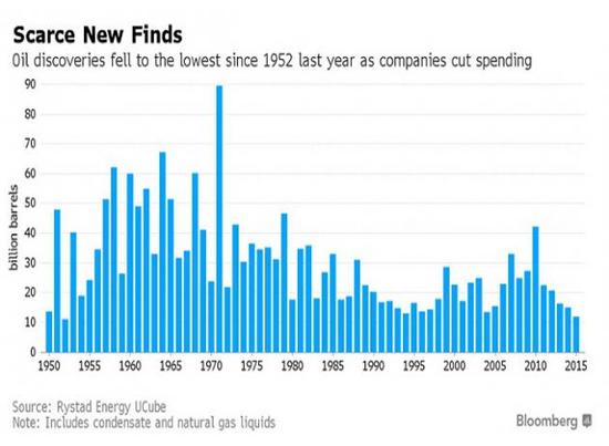 位于挪威首都奧斯陸的能源行業(yè)顧問公司Rystad Energy在一份報告中指出,2015年僅發(fā)現(xiàn)121億桶的石油儲備,這一看測量已是連續(xù)第5年下降,并錄得自1952年來最低勘測水平。