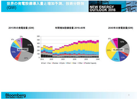 由此,2040年各類電源在整體發電容量中所占的比例將由2015年的光伏發電4%、風力發電7%,大幅增至光伏發電為29%、風力發電為13%。