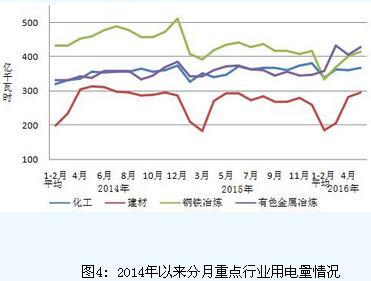 1-5月份,化學原料制品、非金屬礦物制品、黑色金屬冶煉和有色金屬冶煉四大高載能行業(yè)用電量合計6774億千瓦時,同比下降3.6%,增速比上年同期回落2.0個百分點;合計用電量占全社會用電量的比重為29.7%,對全社會用電量增長的貢獻率為-42.3%。其中,化工行業(yè)用電量1773億千瓦時,同比增長4.4%,增速比上年同期提高2.8個百分點;建材行業(yè)用電量1153億千瓦時,同比下降1.5%,增速比上年同期提高5.1個百分點;黑色金屬冶煉行業(yè)用電量1858億千瓦時,同比下降10.2%,增速比上年同期回落3.7個百分點;有色金屬冶煉行業(yè)1990億千瓦時,同比下降5%,增速比上年同期回落10.0個百分點。