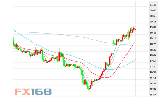 美國WTI原油期貨交投于 48.78至49.99美元/桶之間,收于49.91美元/桶,上漲1.35美元或2.78%。