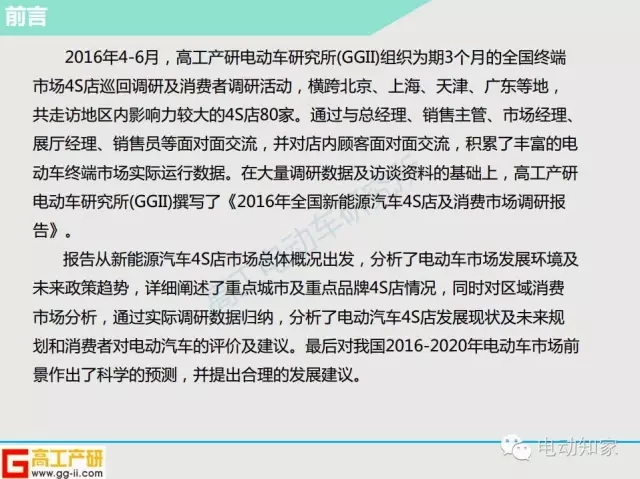 2016年4-6月,高工產研電動車研究所組織了為期3個月的全國終端市場4s店巡回調研及消費者調研活動,橫跨北京、上海、天津、廣東等地,共走訪地區影響力較大的4s店80家。本文從新能源汽車4s店市場總體概況出發,分析了電動汽車市場發展環境及未來政策趨勢,詳細闡述了重點城市及重點品牌4s店情況,同時對區域消費市場分析,通過實際調研數據歸納,分析了電動汽車4s店發展現狀以及未來規劃和消費者對電動汽車的評價和建議。最后對我國2016-2020年電動汽車市場前景做出了科學預測,并提出了合理的發展建議。