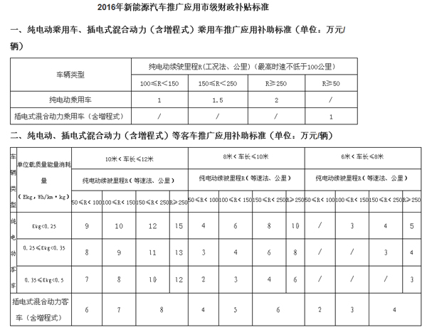 1、2016年新能源汽車推廣應用市級財政補貼標準