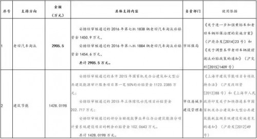 1、按照《上海市人民政府辦公廳印發市交通委等六部門制訂的<關于進一步加強黃標車和老舊車輛環保治理的實施方案>的通知》(滬府辦發[2014]23號)、《關于調整本市老舊車輛提前淘汰補貼政策的通知》(滬交科[2015]1409號)等有關規定,安排經審核通過的2016第七批1838輛老舊汽車淘汰補貼資金1450.9萬元,第八批1884輛老舊汽車淘汰補貼資金1454.6萬元,共計2905.5萬元。