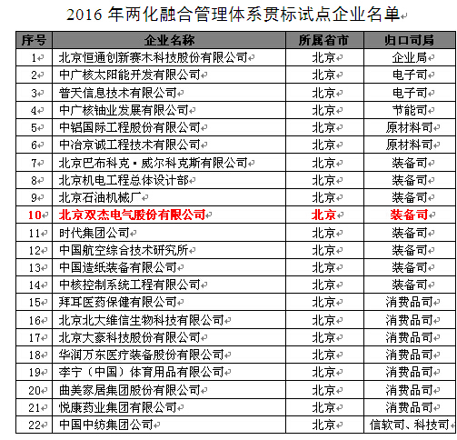 日前,工信部發(fā)布了《關(guān)于公布2016年兩化融合管理體系貫標(biāo)試點(diǎn)企業(yè)名單的通知》(工信廳信軟函〔2016〕359號(hào))。北京市共有22家企業(yè)評(píng)選為兩化融合管理體系貫標(biāo)試點(diǎn)企業(yè)(詳見(jiàn)附表)。北京雙杰電氣股份有限公司(下文簡(jiǎn)稱(chēng):雙杰電氣,股票代碼:300444)作為民族電力設(shè)備制造企業(yè)榜上有名,順利通過(guò)兩化融合管理體系貫標(biāo)試點(diǎn)企業(yè)評(píng)定,成為全國(guó)兩化融合管理體系貫標(biāo)試點(diǎn)評(píng)定企業(yè)之一。