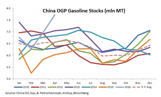 隨著中國原油及制品的進口量遠超過實際需求,中國的汽油庫存也升至創紀錄高位。換言之,全球過剩不僅在原油和餾分油層面,也波及到全球汽油庫存。