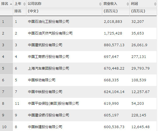 盡管在2015年因油價暴跌導(dǎo)致營業(yè)收入大幅下降,但“兩桶油”在今年的榜單上仍然穩(wěn)居前兩位,其中中石化營業(yè)收入2.02萬億元,中石油1.73萬億元,分別比2014年下降28.6%和24.4%。中國建筑和工商銀行繼續(xù)位列第三和第四。中國移動排名連續(xù)第二年下滑一位,今年跌至第六,被上汽集團(tuán)超越。新上榜的公司包括樂視、攜程等互聯(lián)網(wǎng)企業(yè)。