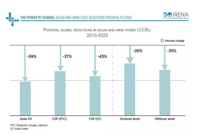 根據(jù)國(guó)際可再生能源署9月3號(hào)發(fā)布的報(bào)告預(yù)測(cè),光伏、光熱、陸上和海上風(fēng)電成本將大幅度下降:
