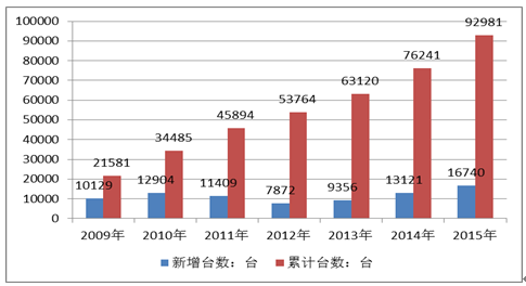 2015年,全國(除臺灣地區外)新增裝機容量30753MW,同比增長32.6%,新增安裝風電機組16740臺,累計裝機容量145362MW,同比增長26.8%,累計安裝風電機組92981臺。