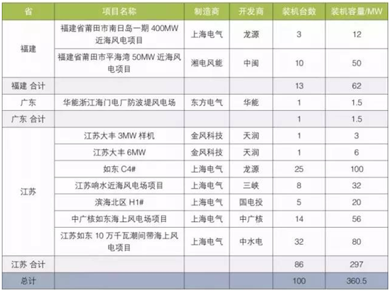 2015 年,中國海上風電新增裝機100 臺,容量達到360.5MW,同比增長58.4%。其中,潮間帶裝機58 臺,容量181.5MW,占海上風電新增裝機總量的50.35% ;其余49.65% 為近海項目,裝機42 臺,容量179MW。2015 年,上海電氣的海上風電機組供應量最大,占比達到83.2% ;其次是湘電風能,海上風電吊裝容量占比為13.9%。