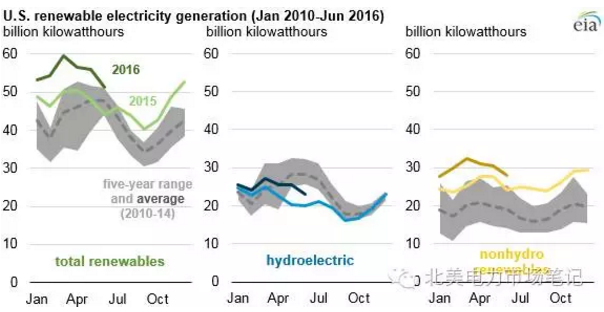 截止今年6月數(shù)據(jù),美國可再生能源發(fā)電水平已經(jīng)超過往年。水電和非水電可再生能源均對此作出貢獻(xiàn),但是方式有所不同。2015年下半年經(jīng)過長時間的西海岸干旱后,水利發(fā)電開始增長,并接近歷史水平。同時,非水電可再生能源發(fā)電每年不斷增長,并從2016年2月開始月發(fā)電量開始超過水電。