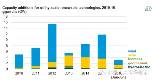 近3年美國新增發(fā)電裝機(jī)中非水電可再生能源發(fā)電裝機(jī)占主導(dǎo)地位。而近幾年來太陽能和風(fēng)電廠建造成本也在迅速下降。還有很多因素刺激了非水電可再生能源的增長,包括各州對可再生能源的份額要求和稅收優(yōu)惠政策。關(guān)鍵稅收抵免政策,包括production tax credit和investment tax credit,在近年來都產(chǎn)生了重要影響,并在2015年12月此政策獲得了延長。