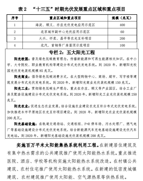 《規(guī)劃》提出,要全面推廣太陽(yáng)能利用。以全面推進(jìn)分布式光伏發(fā)電和普及太陽(yáng)能熱水系統(tǒng)的廣泛應(yīng)用為重點(diǎn),大力推動(dòng)實(shí)施“陽(yáng)光雙百”計(jì)劃。“十三五”時(shí)期,全市新增光伏發(fā)電裝機(jī)容量100萬千瓦、太陽(yáng)能集熱器面積100萬平方米。實(shí)施百萬千瓦光伏發(fā)電工程。加快分布式光伏在各領(lǐng)域應(yīng)用,實(shí)施“陽(yáng)光校園、陽(yáng)光商業(yè)、陽(yáng)光農(nóng)業(yè)、陽(yáng)光基礎(chǔ)設(shè)施”等五大陽(yáng)光工程。倡導(dǎo)綠色低碳生活方式,積極支持居民安裝分布式光伏發(fā)電系統(tǒng),鼓勵(lì)新建住宅小區(qū)、郊區(qū)低密度住宅、農(nóng)村住宅使用分布式光伏發(fā)電系統(tǒng)。結(jié)合資源和環(huán)境條件,積極探索利用關(guān)停礦區(qū)、荒灘荒坡、垃圾填埋場(chǎng)護(hù)坡建設(shè)大型地面光伏電站。重點(diǎn)建設(shè)順義、海淀、亦莊等一批光伏集中應(yīng)用示范區(qū),實(shí)施北汽廠房屋頂、首鋼廠房屋頂、農(nóng)光互補(bǔ)等一批光伏集中應(yīng)用示范項(xiàng)目。