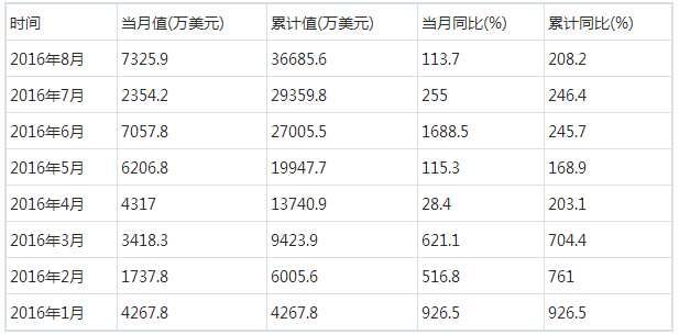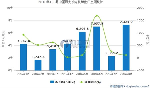 數(shù)據(jù)顯示,2016年1-8月中國風(fēng)力發(fā)電機(jī)組出口金額為36685.6萬美元,同比增長208.2%。其中,8月出口金額現(xiàn)今年最高峰,達(dá)到7325.9萬美元。2016年1-8月中國風(fēng)力發(fā)電機(jī)組出口金額統(tǒng)計(jì)表如下表所示: