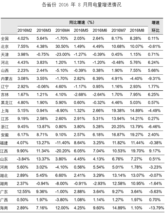 2016 年 1-8 月,全國(guó)有寧夏、云南、青海、甘肅 4 省用電呈現(xiàn)負(fù)增長(zhǎng)。從分省情 況來(lái)看,用電量同比增長(zhǎng)超過全國(guó)平均水平的省份依次為:西藏(17.77%)、新疆 (12.24%)、江西(9.74%)、安徽(9.52%)、陜西(9.24%)、浙江(8.66%)、 北京(6.98%)、上海(6.90%)、江蘇(6.85%)、湖北(6.68%)、福建(6.28%)、 海南(6.25%)、廣東(4.88%)。這些省份大部分分布在華東、華中、南方地區(qū), 為外送電較多、經(jīng)濟(jì)發(fā)展較快的省份。