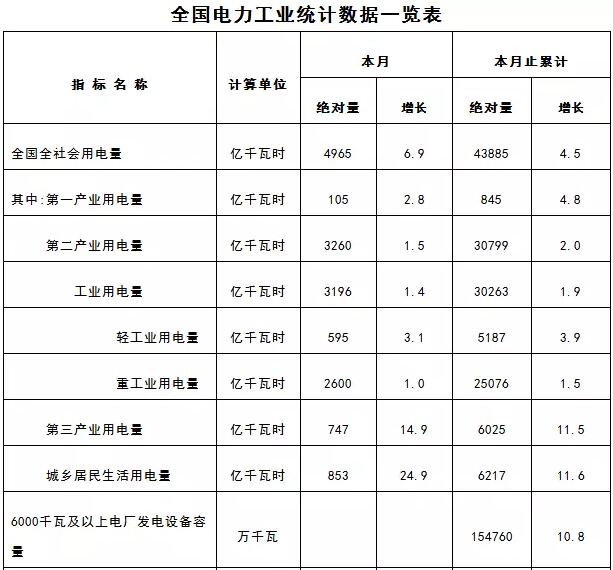 10月17日,國家能源局發(fā)布9月份全社會用電量4965億千瓦時,同比增長6.9%;1-9月,全國全社會用電量累計43885億千瓦時,同比增長4.5%。
