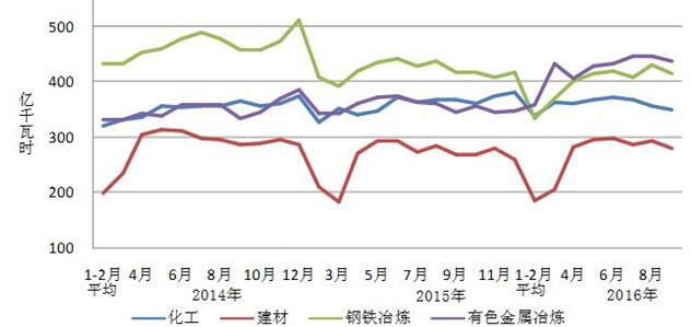 9月份,四大高載能行業(yè)用電量合計(jì)1484億千瓦時(shí),同比增長0.6%,增速比上年同期提高3.5個(gè)百分點(diǎn),占全社會(huì)用電量的比重為29.9%。其中,化工行業(yè)用電量350億千瓦時(shí),同比下降4.9%,增速比上年同期回落5.5個(gè)百分點(diǎn);建材行業(yè)用電量281億千瓦時(shí),同比增長4.1%,增速比上年同期提高11.2個(gè)百分點(diǎn);黑色金屬行業(yè)用電量416億千瓦時(shí),同比下降0.7%,增速比上年同期提高7.8個(gè)百分點(diǎn);有色金屬冶煉行業(yè)438億千瓦時(shí),同比增長4.3%,增速比上年同期提高0.1個(gè)百分點(diǎn)。