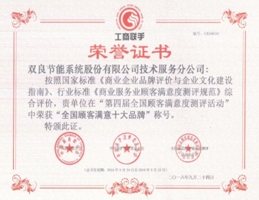 9月24日,第四屆全國顧客滿意度測評活動揭曉發布暨頒獎大會在西安舉行,雙良節能系統股份有限公司憑借其前瞻的服務理念、優質的服務實踐以及良好的口碑,榮獲“全國顧客滿意十大品牌”稱號。