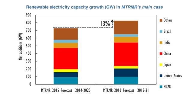 國(guó)際能源署(IEA)上周二發(fā)布的2016中期可再生能源市場(chǎng)報(bào)告稱,2015年可再生能源超過(guò)煤炭,成為全球范圍內(nèi)新增發(fā)電裝機(jī)容量的最大來(lái)源,并且預(yù)計(jì)可再生能源裝機(jī)容量在未來(lái)五年也將實(shí)現(xiàn)持續(xù)增長(zhǎng)。