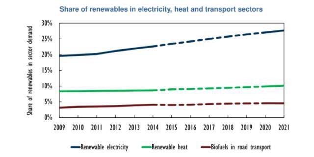 到2021年,可再生能源在各個(gè)領(lǐng)域的應(yīng)用都實(shí)現(xiàn)了增長(zhǎng),能源轉(zhuǎn)換效率和可再生能源之間的交互作用變得越來(lái)越重要。盡管可再生能源發(fā)電占總電量比例將持續(xù)提高,到2021年預(yù)計(jì)可達(dá)到28%,但可再生能源供熱和交通用生物燃料在未來(lái)5年內(nèi)預(yù)計(jì)增長(zhǎng)緩慢。