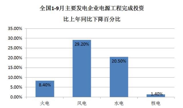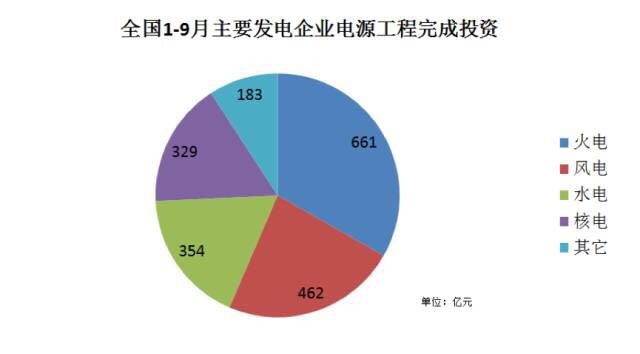1-9月份,全國(guó)主要發(fā)電企業(yè)電源工程完成投資1989億元,比上年同期下降10.9%。各個(gè)類別的電源完成投資都有下降,水電完成投資354億元,同比下降20.5%;火電完成投資661億元,同比下降8.4%;風(fēng)電完成投資462億元,同比下降29.2%;核電完成投資329億元,同比下降1.4%。