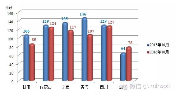 由以上圖表可以看出,2016年10月,新疆平均利用小時數比去年同期增加14小時,四川與去年同期基本持平,其他四省與去年同期相比均有不同程度降低。其中新疆10月平均利用小時數為78小時,比去年同期增加14小時;四川10月平均利用小時數為127小時,比去年同期減少2小時;內蒙古10月平均利用小時數為124小時,比去年同期減少5小時;青海10月平均利用小數與去年同期相比變化最為劇烈,減少39小時;甘肅其次,比去年同期減少了21小時;寧夏10月平均利用小數也比去年同期減少了18小時。