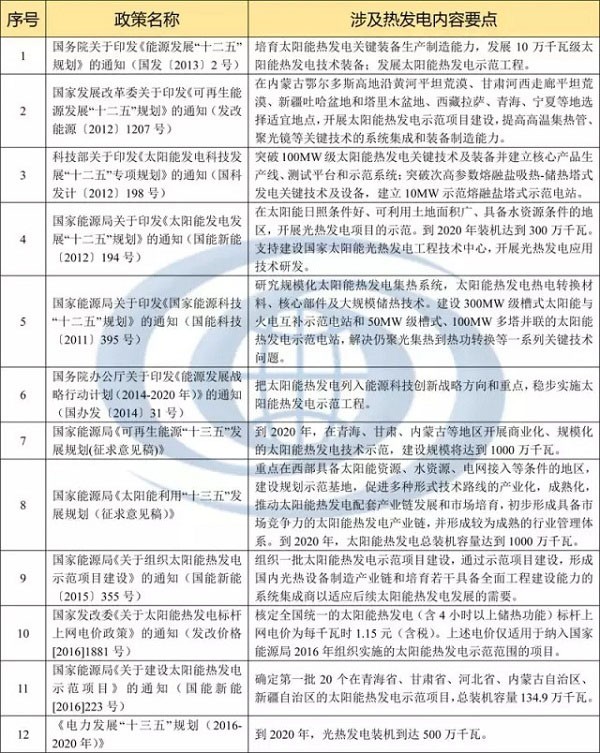 “十二五”以來,國家層面、國家發(fā)展改革委、能源局和科技部先后出臺多項規(guī)劃和政策支持太陽能熱發(fā)電產(chǎn)業(yè)發(fā)展,具體政策匯總見下表:
