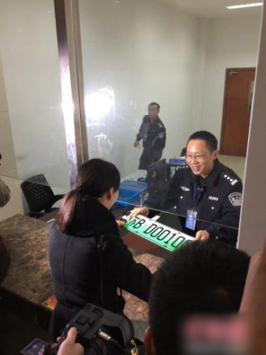 12月1日,在新能源汽車(chē)號(hào)牌首發(fā)當(dāng)天,車(chē)主許女士領(lǐng)取無(wú)錫首塊新能源汽車(chē)號(hào)牌蘇BD00100。 王修 攝