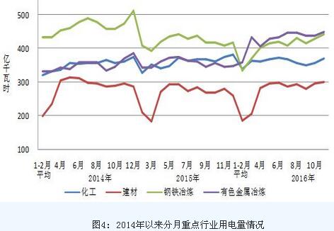 1-11月份,化學原料制品、非金屬礦物制品、黑色金屬冶煉和有色金屬冶煉四大高載能行業用電量合計15922億千瓦時,同比下降0.9%,增速比上年同期提高1.9個百分點;合計用電量占全社會用電量的比重為29.6%,對全社會用電量增長的貢獻率為-5.4%。其中,化工行業用電量3956億千瓦時,同比增長1.2%,增速比上年同期回落1.1個百分點;建材行業用電量2911億千瓦時,同比增長2.4%,增速比上年同期提高8.8個百分點;黑色金屬冶煉行業用電量4407億千瓦時,同比下降5.0%,增速比上年同期提高3.4個百分點;有色金屬冶煉行業4647億千瓦時,同比下降0.4%,增速比上年同期回落3.2個百分點。