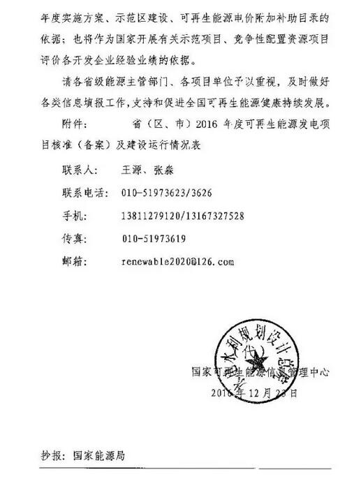 近日國家可再生能源信息管理中心發布《關于進一步做好可再生能源信息管理工作的函》。文件指出開展2016年度全國可再生能源發電發展情況統計工作。請各省級能源主管部門明確可再生能源信息統計工作聯系人,于2017年1月5日前將2016年度轄區內可再生能源發電項目核準(備案)及建設運行情況電子版報送日國家可再生能源信息管理中心。以下為文件原文: