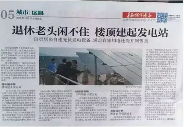 2015年10月16日,《華西都市報》報道了四川自貢退休老人在樓頂自建光伏電站,獲取售電補貼,并借以養老的故事。